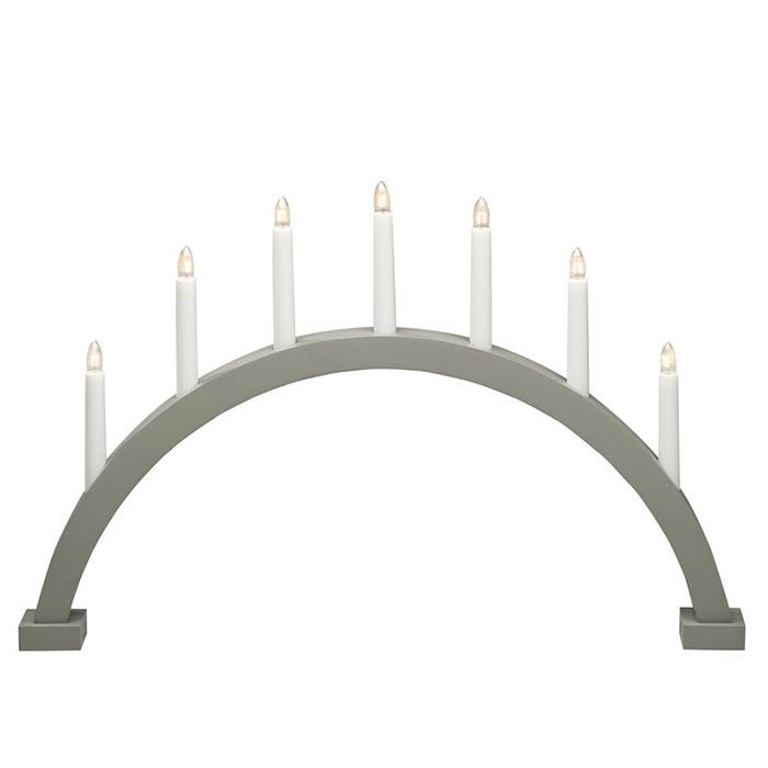 7-armad ljusstake i matt grågrönlackerat trä med vit kabel och strömbrytare. Ljusstaken är bågformad och är 59 cm bred och 38,5 cm hög med en kabel på 1,7 m.
