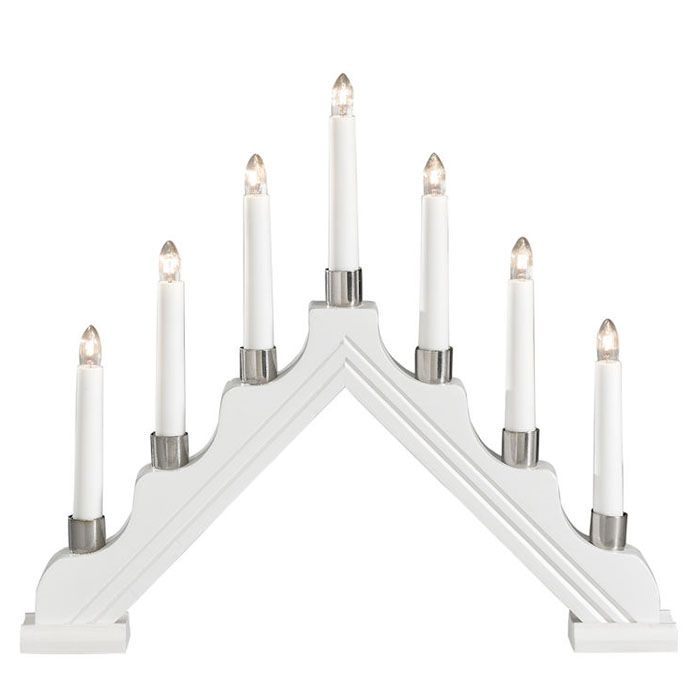 En kassisk 7-armad ljusstake i trä med varmvita lampor. Lackad i vitt. Silverfärgade dekorationsringar. Anslutningssladd på 1,7 meter. Strömbrytare för manuell avstängning/påslagning. Höjd 34cm och bredd 39cm.