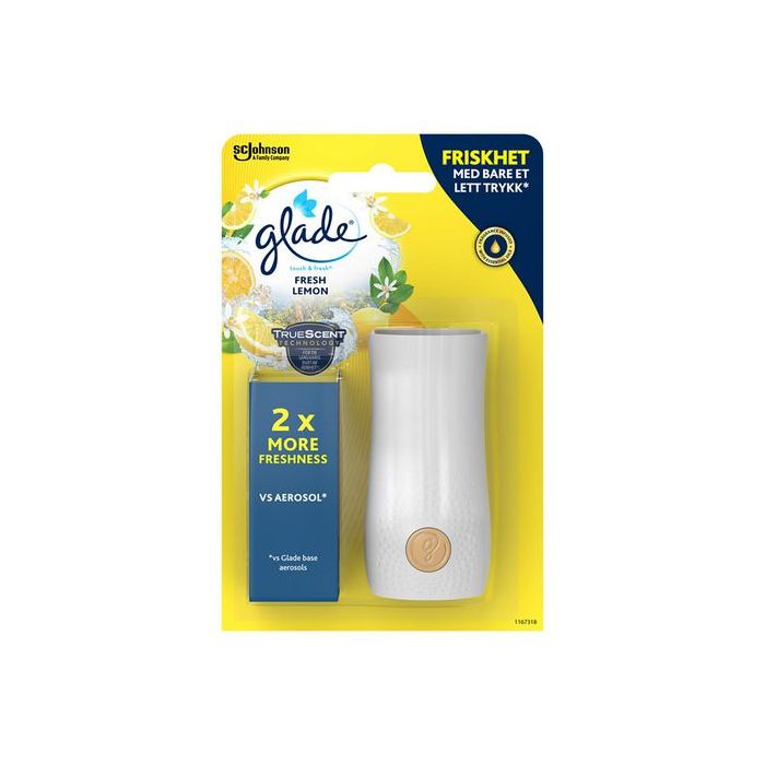 Startkit med doftspridare och 10 ml fresh refill, doft av citron, mandarin och persika. Fräscha upp luften med ett enkelt tryck av Glade Touch & Fresh Lemon Holder. Den innovativa formulan ger två gånger mer fräschhet jämfört med traditionella aerosoler, och tack vare den kompakta, eleganta designen passar den i alla rum. Upplev en sprudlande blandning av citron, gyllene mandarin och saftig persika som skapar en fruktig och fräsch atmosfär. Startkitet innehåller en 10 ml refill och en smidig doftspridare – perfekt för kontinuerlig luftfräschör där du behöver det som mest.