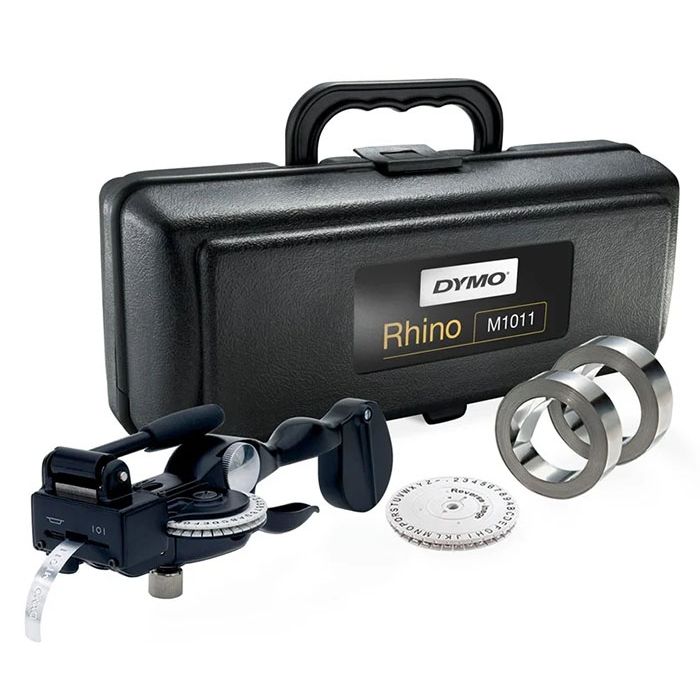 Skapa hållbara, professionella metalletiketter med den industriella DYMO Rhino M1011-präglingssatsen.