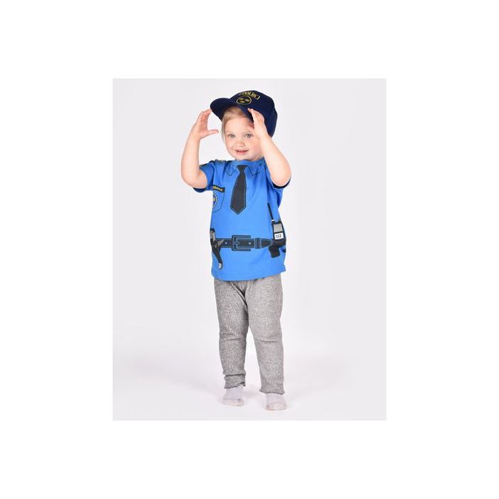 Grip de busiga tjuvarna i detta coola polisset, den perfekta uniformen för unga hjältar. Den bekväma bomullströjan i en snygg blå nyans är dekorerad med tryck som speglar sagovärldens bästa polisers atmosfär. Tröjan har korta ärmar, rund halsringning, tryck både fram och bak samt fastsydda gula band på axlarna för extra detalj. Den klassiska blå modellen har även broderi fram och bak. Leken blir komplett med den tillhörande kepsen med justerbart kardborrefäste baktill, ett perfekt val för små äventyrare som vill klä ut sig och skapa sina egna lekfulla polisäventyr.