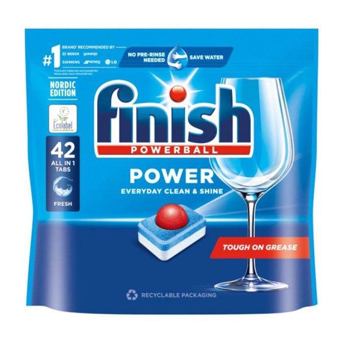 Finish maskindisktabletter Power All In 1 tar bort även tuffa matrester från din disk och ger en effektiv rengöring. Finish All In One diskmedelstabletter är en powerball som löser upp och tar bort även de tuffaste matresterna, även i hårt vatten. De skyddar samtidigt mot glaskorrosion så att dina glas behåller sin lyster längre. Finish All-in-1 Powerball diskar bort rester och ger en fin glans även i hårt vatten. Tabletternas salt- och sköljfunktion avlägsnar rester och hjälper till att ta bort fläckar och beläggningar.
