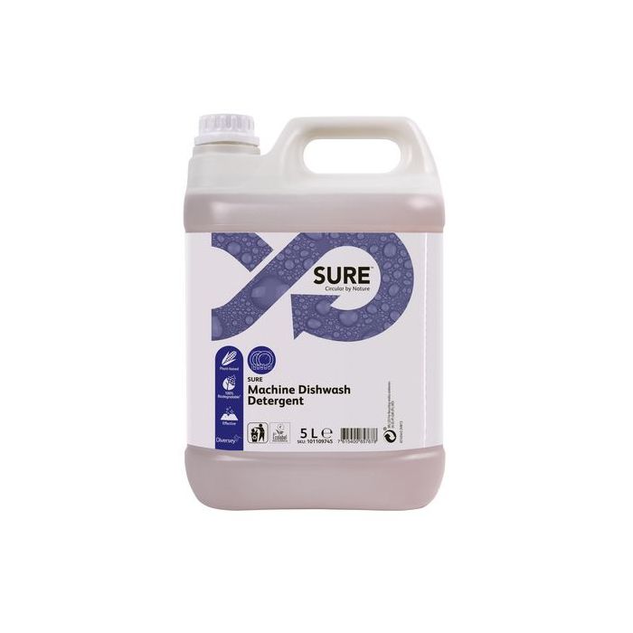 SURE Maskindiskmedel ingår i ett unikt sortiment av växtbaserade, 100% biologiskt nedbrytbara professionella rengöringsprodukter för alla dagliga rengöringsbehov. Det är ett koncentrerat flytande diskmedel för maskindisk. Effektivt för att avlägsna smuts i hårt va tten.