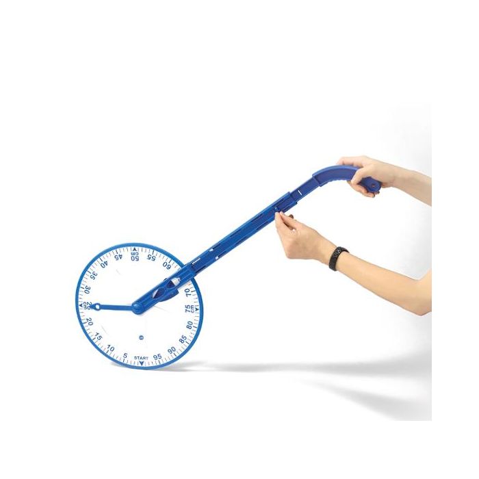 Mät avstånd enkelt – med ett justerbart meterhjul. Upptäck ett praktiskt meterhjul som gör det roligt och enkelt för barn att mäta olika sträckor. Den tydliga visaren hjälper till att läsa av längden direkt. Hjulet kan ställas in med eller utan klickljud – välj klick vid varje meter eller decimeter för extra tydlighet. Skaftet är justerbart i fyra lägen, vilket gör det bekvämt för olika användare. Perfekt för lek, lärande och pedagogiska aktiviteter där längd och avstånd står i fokus. Mått: längd 84 cm ø 45 cm Material: Polystyren- och polyetylenplast, metall, däcket runt hjulet av TPR PVC fri CE