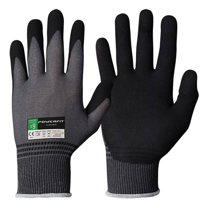 Touchscreen kompatibla montagehandskar från Granberg med nitrilskumbeläggning.