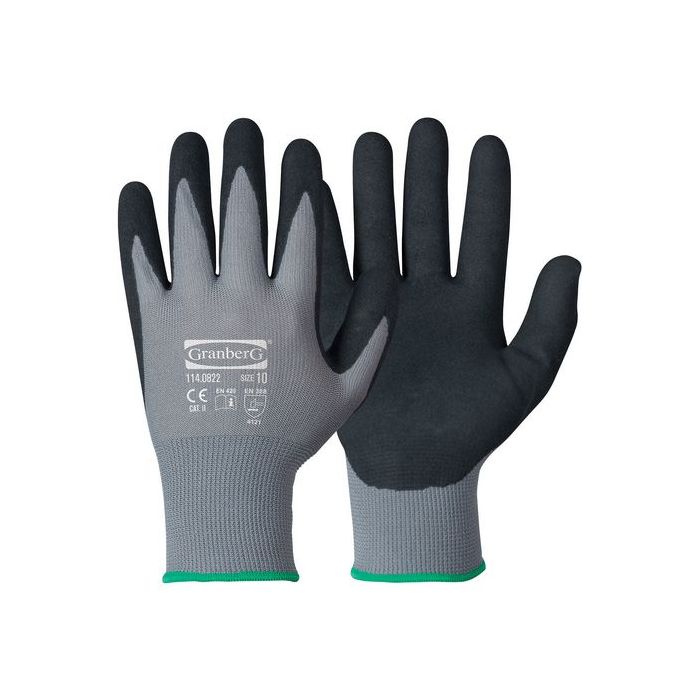 Montagehandskar i polyester med sandaktig nitrilbeläggning med hög slitstyrka. Handskarna har ett bra grepp både i torra, våta och o ljiga miljöer. Lämpliga för lätt till medeltungt arbete inom montering, transport, underhåll, industri, anläggning och lager.