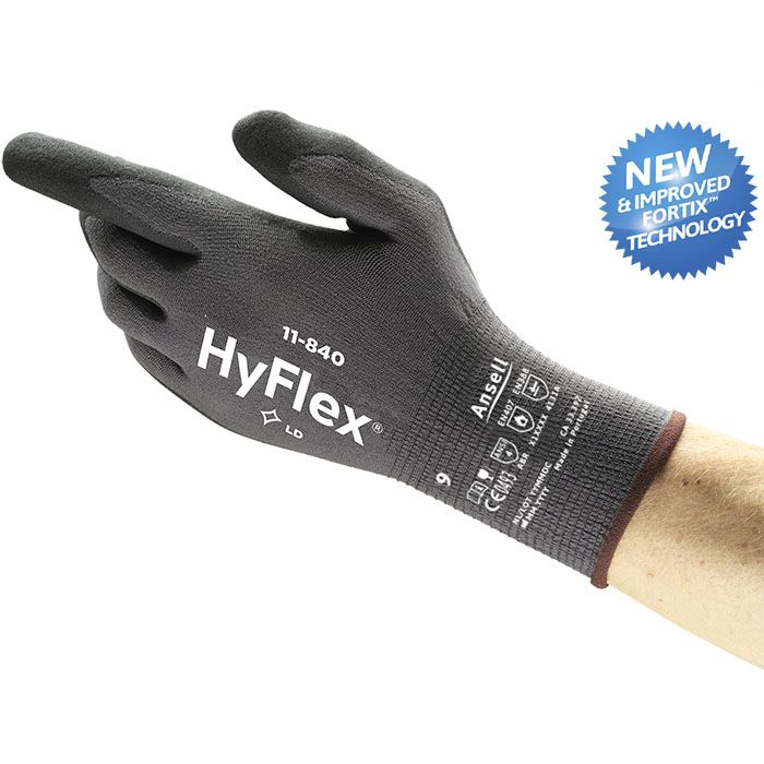 HyFlex 11-840 har en balans mellan robust nötningshållfasthet, förbättrad komfort och god fingerkänsla som gör handsken till en idealisk lösning för personer som växlar mellan olika arbetsuppgifter. Den är upp till två gånger mer hållbar än premiumnitrilhandskar för allmänt bruk.