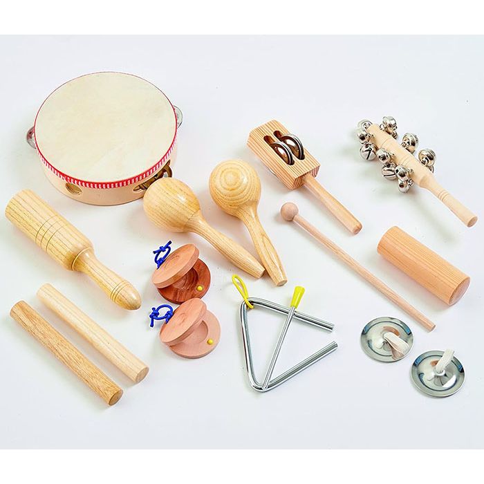 En aktivitetsguide finns tillgänglig för nedladdning på 8 olika språk, med idéer för att hjälpa barn att utforska musik, rytm och ljud. Instrumenten inkluderar: 2 trämaracas, 2 träkastanjetter, en trätamburin, en metalltriangel med klubba, 2 träklaver, en trärytmklappare, en träguirro med klubba, 2 metallfingercymbaler, en träskakare och en 13-klockig träklangpinne. Stödjer följande inlärningsområden:
