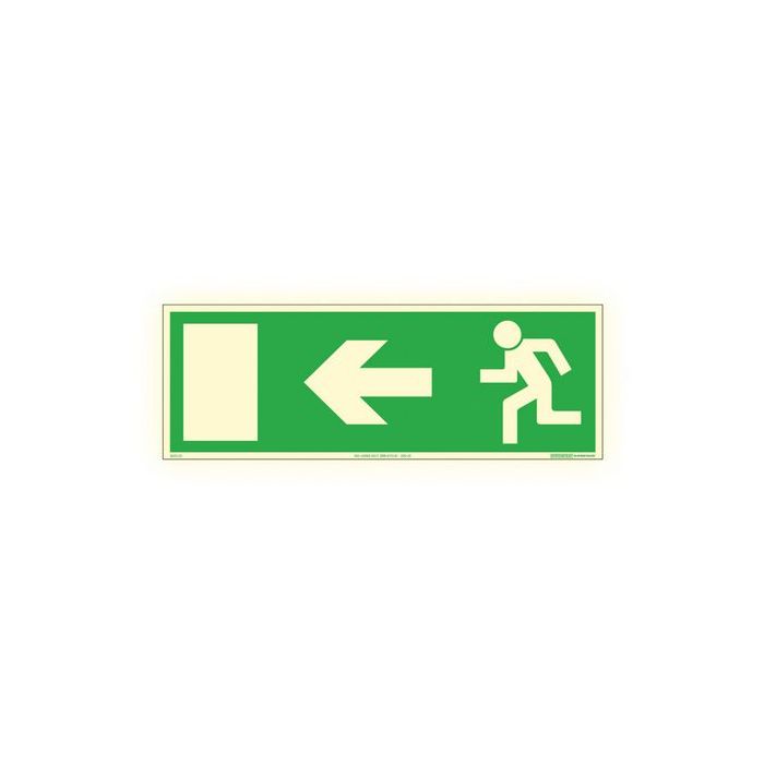 Efterlysande skylt i aluminium i storlek 420 x 148 mm. Symboler och utformning enligt AFS 2008:13, med betydelsen 'Härifrån till vänster'.