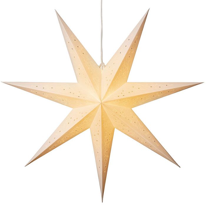 Hängande pappersstjärna med 7 uddar och broderat mönster. Sladdställ med 5 meter anslutningssladd ingår, E14-sockel. Sladdströmbrytare. Diameter 78 cm
