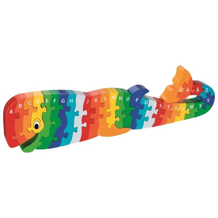 Färgglatt alfabetpussel Whoopi the Whale med 29 delar. Hjälper barnet att lära sig alfabetet. Stora bitar som är perfekta att gripa för små händer. Eftersom pusslet är 2,5 cm tjockt står den stadigt och kan även användas som dekoration efter den har sätts ihop.