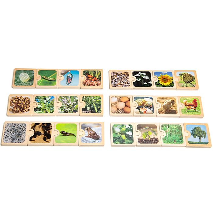 Perfekt pussel för att lära barn livscykler. Barn lär sig livscyklerna för en kyckling, groda, fjäril, bondböna, solros och ek genom att placera de 4 sekvensbrickorna i rätt ordning. Alla brickor är självkorrigerande med rätt mönster som visas på undersidan av varje bricka. Värmeöverföringsgrafik med bilder från verkliga livet är extremt slitstarka. Tillverkad av robusta plywoodbitar och de är lätta att sammanfoga och ta isär igen.