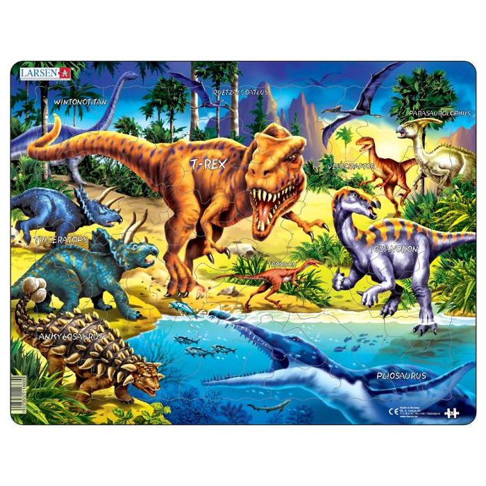 Res tillbaka till kritaperioden – pussla mäktiga dinosaurier! Utforska en svunnen tid med Larsen Maxi Dinosauriepussel. Detta 57-bitars pussel visar imponerande dinosaurier från kritaperioden i en detaljrik miljö. Perfekt för barn som fascineras av förhistoriska djur och vill lära sig mer om jordens historia på ett roligt och pedagogiskt sätt. Antal bitar: 57 Mått: 36,5 x 28,5 cm Rekommenderad ålder: från 6 år