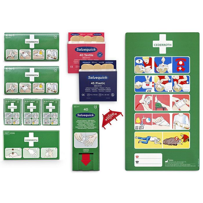 Innehåller: 2 st Cederroth 4-in-1 Blodstoppare. 3 st Cederroth 4-in-1 Mini Blodstoppare. 1 st Savett Sårtvättare (40 st). 1 st Cederroth Skyddspaket. 1 st Salvequick Plastplåster-refill. 1 st Salvequick Textilplåster-refill. 1 st Första Hjälpen-instruktion. Till Cederroth art nr 190900