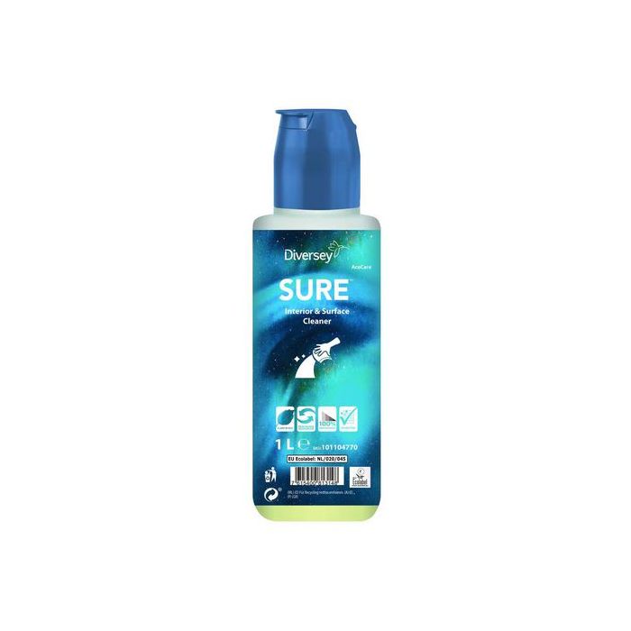 SURE Interior & Surface Cleaner är en del av ett unikt sortiment av växtbaserade, 100% biologiskt nedbrytbara, professionella rengöringsprodukter för alla dina dagliga rengöringsbehov. SURE Interior & Surface Cleaner är ett koncentrerat allrengöringsmedel för alla hårda ytor (även livsmedellokaler), såsom golv, väggar, dörrar, tak och allmän utrustning. Produkten är miljömärkt med EU-Ecolabel.