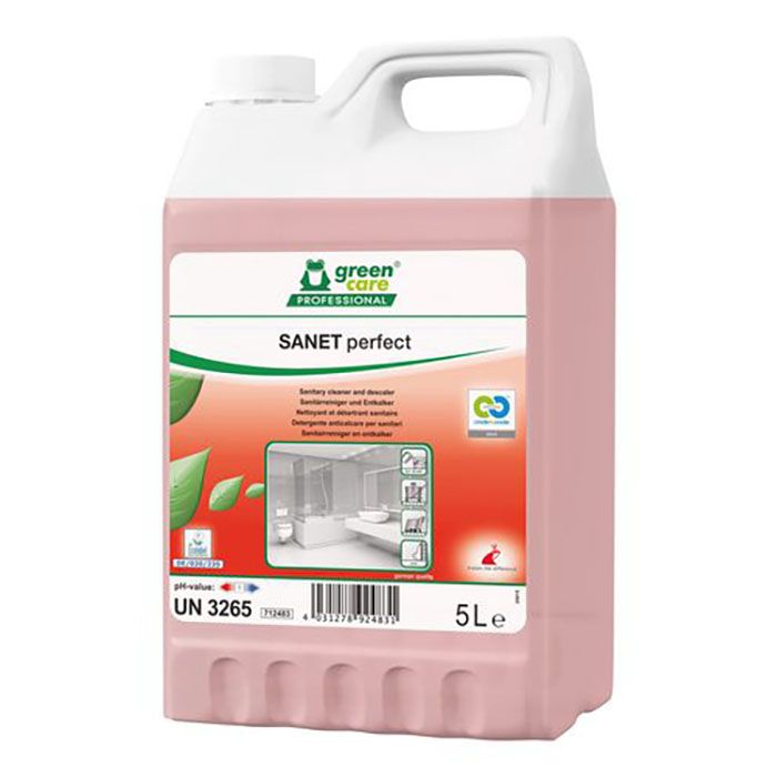 SANET perfect är ett högpresterande rengörings- och avkalkningsmedel med exceptionella miljöegenskaper. Det värnar om människors hälsa och rengöringspersonalens säkerhet. Samtidigt som arbetssäkerheten förbättras, försäkrar den utomordentliga kraften hos SANET perfect enastående resultat med minimala ansträngningar. Lämpar sig för användning på alla syratåliga ytor i sanitära utrymmen.