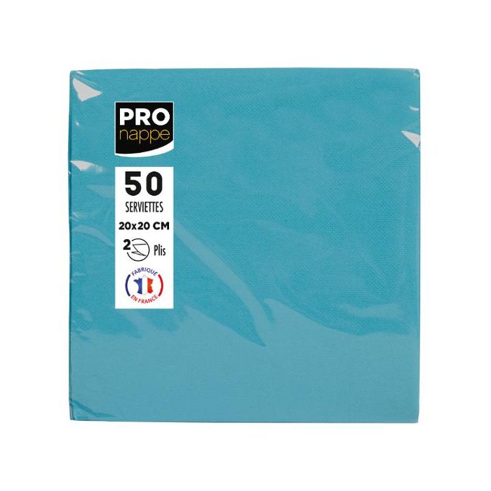 - perfekta för mindre dukningar. Varumärket Pro Nappe erbjuder dukar, servetter, tallrikar och koppar i ljusa, trendiga färger som får dina gäster att känna sig välkomna med stil. Servetterna är mikropräglade, vilket innebär att de har ett fint mönster pressat i ytan för att kännas mjuka och se mer eleganta ut. Den dubbla mikropräglingen ger dem en tjocklek och hållfasthet som är idealisk för vikning. 2-lagers servetterna erbjuder maximal komfort och ger ditt bord den elegans det förtjänar. Med sitt format på 20 x 20 cm passar de utmärkt till cocktailpartyn, både stående och sittande aperitifer, eller som dekorativa underlägg för glas. Dessa FSC-certifierade servetter kommer från ansvarsfullt förvaltade källor. Produkterna tillverkas i Frankrike och är certifierade för kontakt med livsmedel. 2-lagers, turkos 20 x 20 cm 50 st per förpackning FSC Mix Lisvmedelgodkända