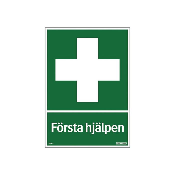 Skylt för första hjälpen med vit text och symbol på grön bakgrund. Symbol enligt ISO 7010. 210 x 297 mm, hårdplast,