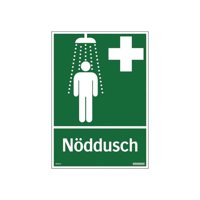 Skylt som visar vart det finns en nöddusch. Med vit symbol och text på grön bakgrund. Storlek: 210 x 297 mm Material: hårdplast, 98 % Pre-consumer återvunnet material