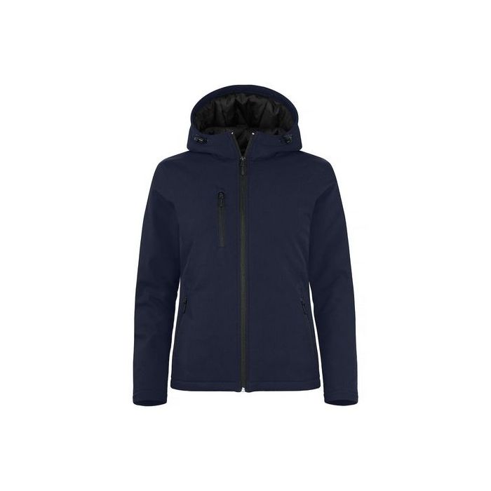 En vadderad softshelljacka med fast huva i modern design. Tre ytterfickor med SBS-dragkedjor och en innerficka. Utrustad med svart foder och dekorerad zippuller. En avtagbar nacketikett för att enkelt kunna addera egen avsändare.