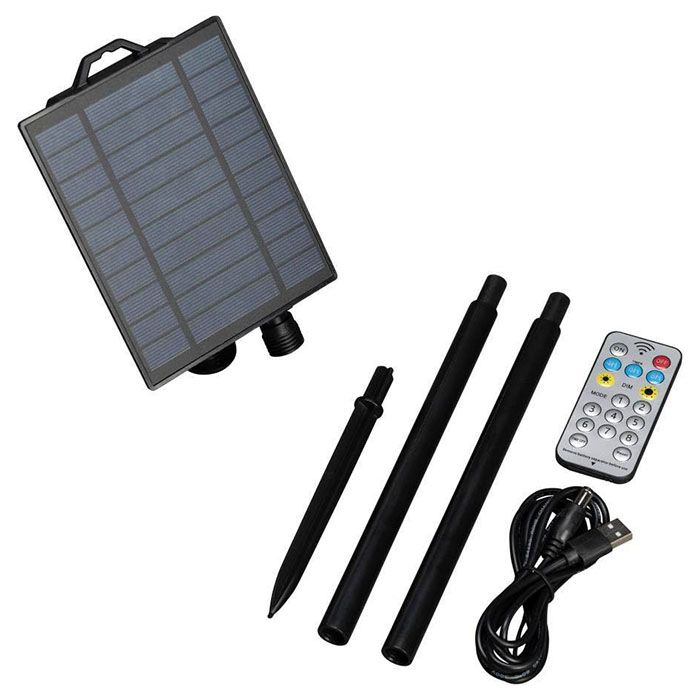 Solpanel och batterilåda för upp till 200 LED med 24V-31V. Timer 4/6/8h. Kan laddas inomhus med en USB-kabel 1,8 m. Markspets ingår. Ljusslinga ingår ej. Inkl. batterier och 180 cm USB-kabel.