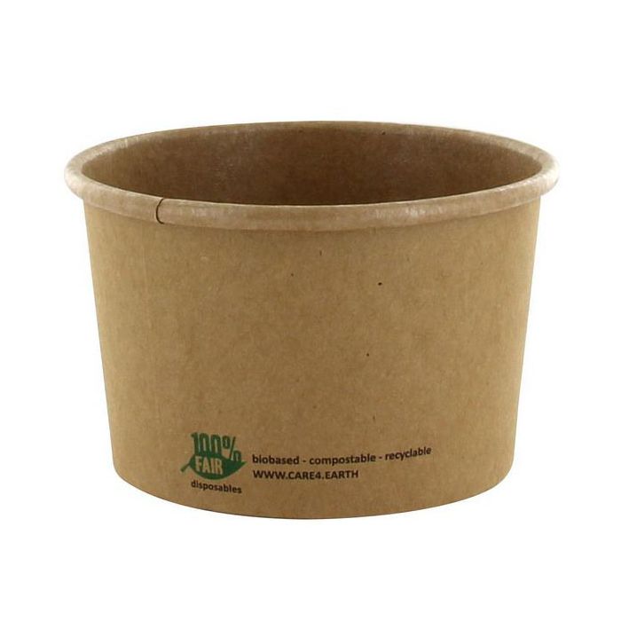 En rund Take-Away soppskål i papp som är tillverkat av förnybara råvaror som är helt biologiskt nedbrytbara.