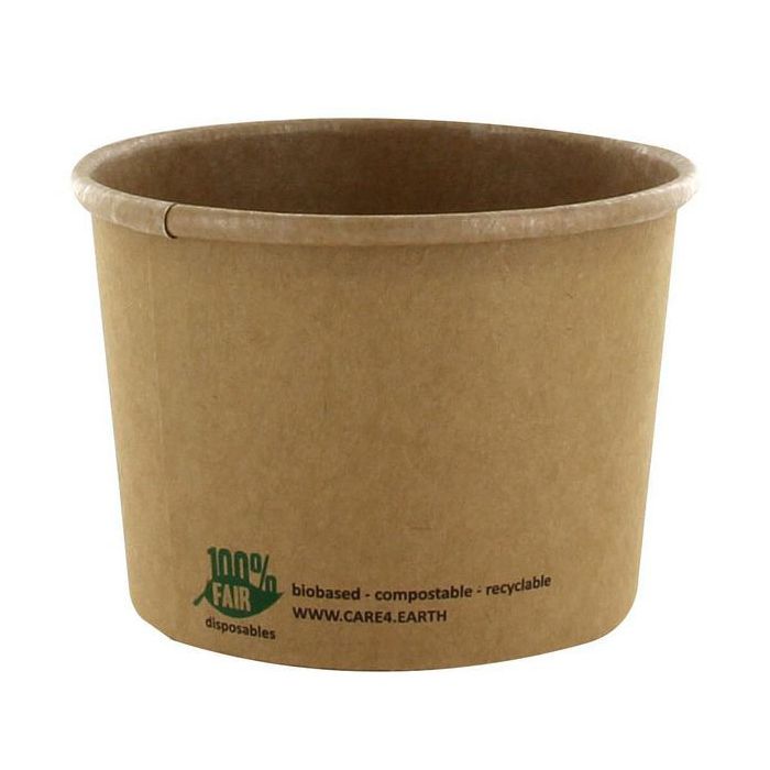En rund Take-Away soppskål i papp som är tillverkat av förnybara råvaror som är helt biologiskt nedbrytbara.