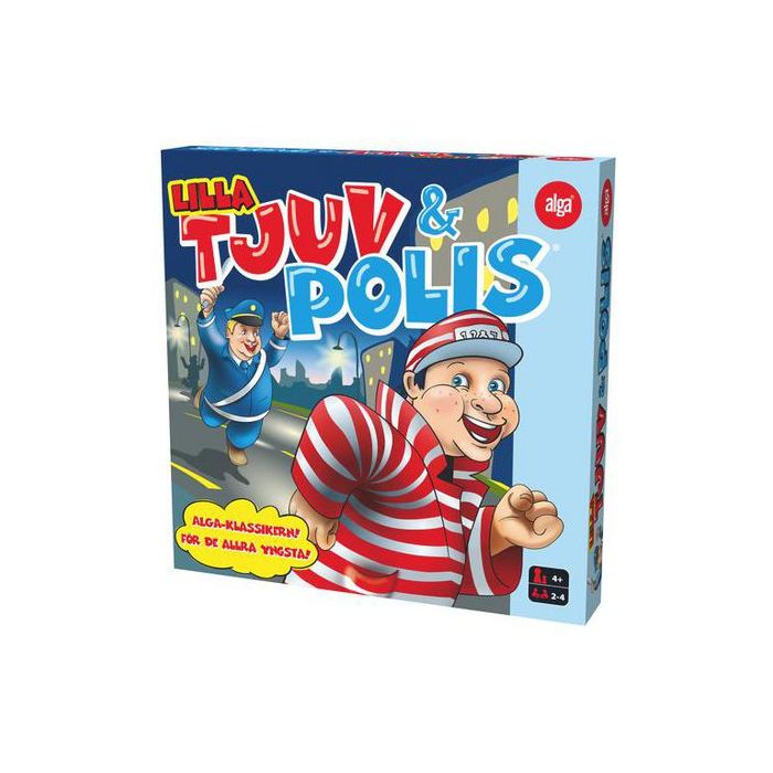 Lilla Tjuv och Polis engagerar hela familjen och är lika kul att spela med de äldre barnen. Här får alla leka polis och jaga de snabbfotade bovarna kors och tvärt över den unika, inbyggda spelplanen. Att fylla finkan med fem fräcka bovar är ingen konst för den som är kvicktänkt. Det gäller bara att komma ihåg vilka bovar som varit snälla och vilka som ska åka fast. Finn och fånga alla fem bovarna – fort, innan de smiter ut igen!