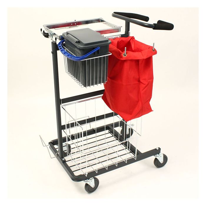 Städkit med vagn och tillbehör. Mellanstor städvagn med komplett utrustning. Städvagnen är stabil och har generöst med plats. Det reglerbara handtaget gör vagnen mer ergonomisk. Svensktillverkade 100 mm kullagerhjul.