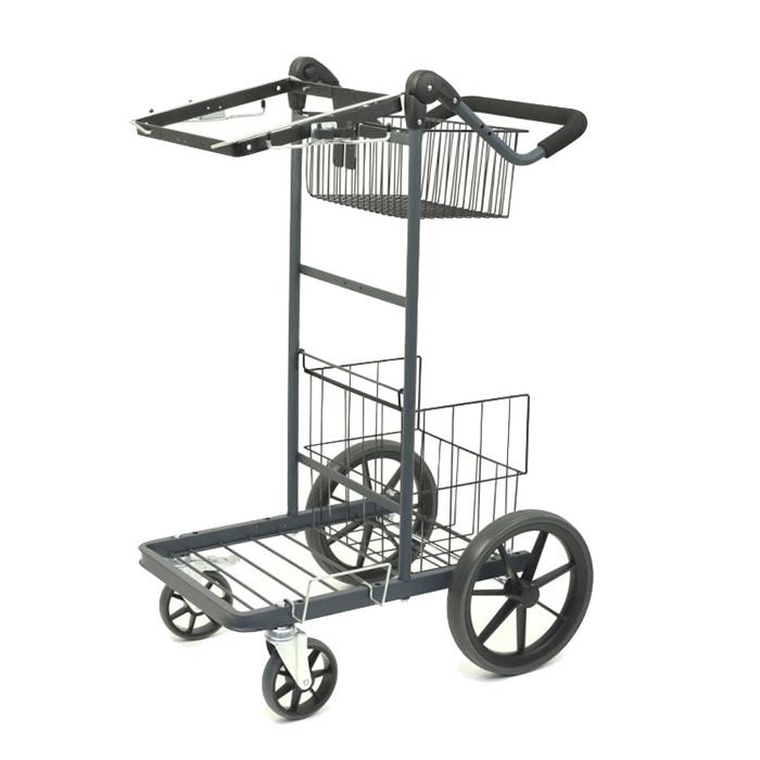 Stabil basvagn som har generöst med plats för material. Plats för två stativ, krokar och med reglerbart handtag.