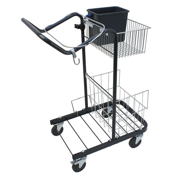 Städvagn Trull. Liten och stabil vagn. Generöst med plats för material. 6-litershink. Krok. Plats för 1 stativ. Lätt rullade 100 mm hjul. Mått (LxBxH): 720x490x975mm Svensktillverkad