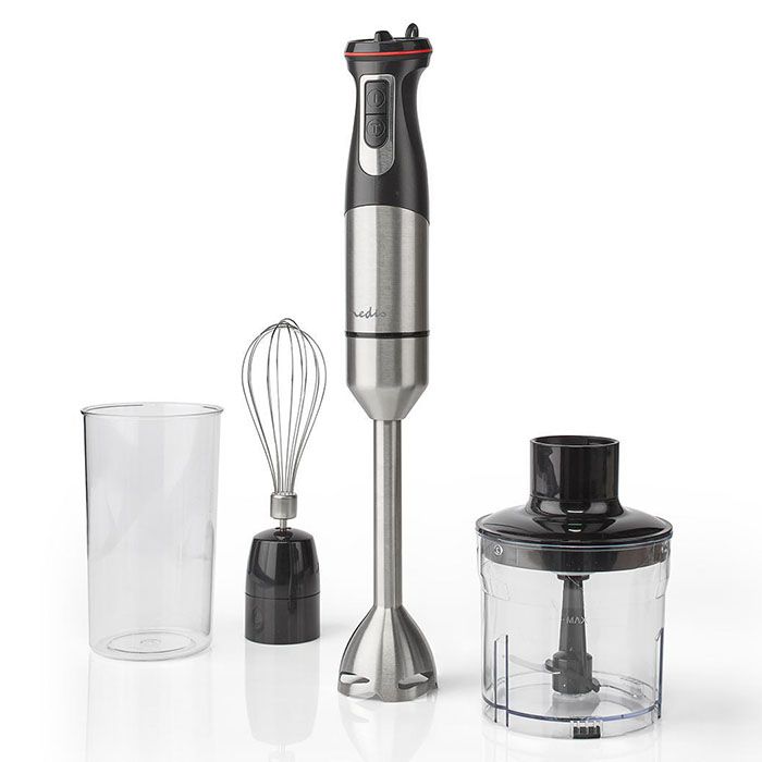 Att blanda och mixa soppor, såser och smoothies har aldrig varit så här enkelt. Mixersatsen är snabbare, mer praktisk och kräver mindre rengöring än en stativmixer. Den har axel och blad i rostfritt stål och flera hastighetsinställningar som gör att den även kan hantera hårda grönsaker och frukt. Vi vill att du ska kunna mixa snabbt, enkelt och ha full kontroll. Därför har den här mixern olika hastighetsinställningar, en turbofunktion och mycket vassa blad av rostfritt stål som skär igenom nästan allt. Det fungerar tack vare motorn på 800W och med endast en knapptryckning. I Nedis 4-i-1-mixersats ingår en behållare på 900ml. Mixa direkt i behållaren med stavmixern och få rätt mängd ingredienser direkt. Hackaren på 500ml fungerar bra när du ska hacka lök, nötter och blomkål medan stavmixern är perfekt för att göra släta soppor, barnmat, juice och smoothies.