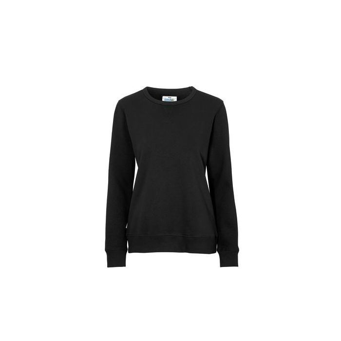 Rundhalsad sweatshirt för dam med borstad insida i normal passform. Dekorationssömmar i overlock som ligger ton i ton. 2x2 ribb runt halskant, mudd i ärmslut och nederkant.