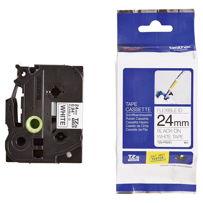 Perfekt för att skriva ut märketiketter för kablar, ledningar, PVC-rör eller vad som helst som är cylindriskt. Det speciella häftämnet på Brother TZeFX251 etikettape, svart på vit, säkerställer att dina viktiga etiketter sitter kvar länge. Kompatibel med P-touch-märkmaskin som har TZ- eller TZe-logotypen på kassettkåpan.