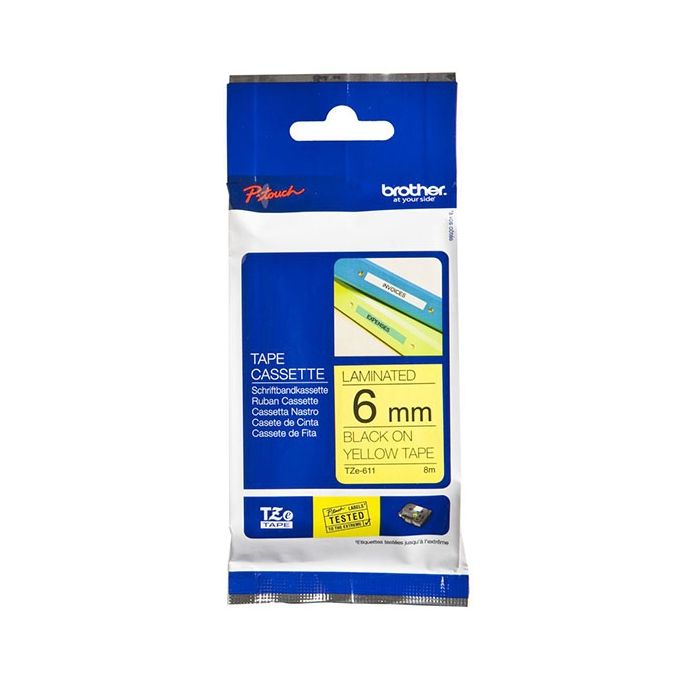 Brothers laminerade TZe-611-tejp är idealisk för användning i vardagen med en rad Brother P-Touch-etikettskrivare för att skapa gula etiketter med svart tryck som skiljer sig från mängden. Den här märkningstejpen är kompatibel med Brother P-Touch-etikettskrivare, använder direkt termisk teknik och har ett extra starkt klister. Använd inomhus eller utomhus på jämna eller gropiga, ojämna ytor. Lamineringen gör etiketterna hållbara med mindre slitage. En ljus bakgrund ger enastående kontrast för svartvita utskrifter, vilket gör att dessa etiketter utmärker sig i miljöer med svag belysning eller där det är viktigt att fånga uppmärksamhet.