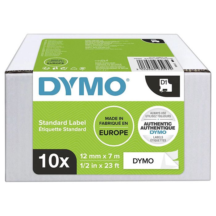 12 mm DYMO® D1 etikettkassett ger snygga, anpassade etiketter i svart på vitt som passar perfekt för användning både inomhus och utomhus. D1-tejp visar text som skrivs ut med termisk präglingsteknik, vilket gör att varken bläck eller toner behövs. Etiketterna är tåliga och hållbara tack vare att de är vattentäta, UV-beständiga och temperaturbeständiga vid mellan -18 grader och 90 grader. De fäster på nästan alla släta och rena ytor, inklusive plast, papper, metall, trä och glas. Den självhäftande polyestertejpen är även avtagbar för kortsiktig märkning utan limrester.