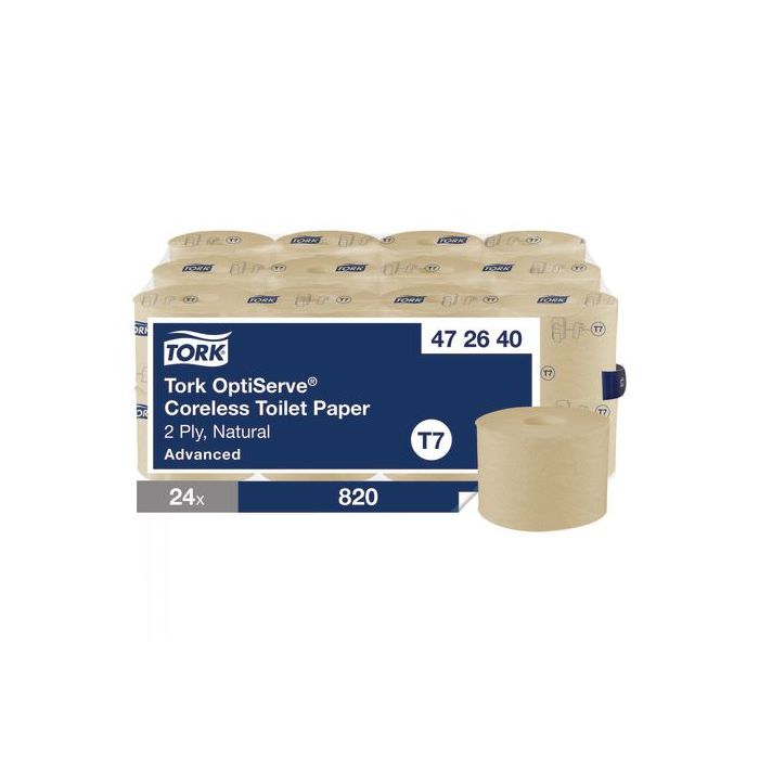 Perforerat 2-lagers toalettpapper utan hylsa med attraktiv design. Tork OptiServe Coreless är ett system med hög kapacitet för toalettpapper utan hylsa som passar anläggningar där effektivitet, hållbarhet och en utmärkt upplevelse är av största vikt. Hög kapacitet, minskad förvaringsplats och en design som är Easy to use-certifierad gör det till ett bättre alternativ än vanligt toalettpapper och jumborullar. Dessa 2-lagers toalettrullar utan hylsa passar en rad olika dispensrar för toalettpapper utan hylsa för att möta behoven i olika toalettutrymmen, så att samma kompakta refiller för toalettpapper kan användas i hela anläggningen. Kompatibel med Tork T7 dispensrar.