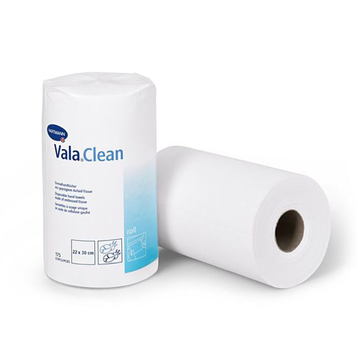 Vala Clean roll är ett mjukt men hållfast papper som kan användas som torkpapper men också som tvättservett. Torkpapper VALA Clean roll är tillverkat av airlaid cellulosa och kommer i praktiska rullar perforerade i 175 ark per förpackning. Rekommenderas att användas tillsammans med Vala Clean box.