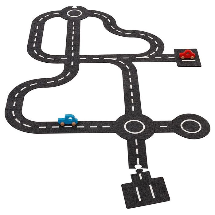Två träbilar ingår. Men generellt: bord, stolar, fåtöljer blir tunnlar, alla befintliga leksaksbilar kan köra på vägen, hela leksaksförrådet kan integreras.