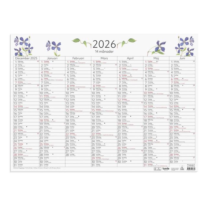 OBS! Almanackor och kalendrar för 2026 preliminär leverans fr.o.m. vecka 37! Kalender som väggblad. 14 månader, december från föregående år och januari för nästkommande år. Sju månader per sida. Namnsdagar och plats för anteckningar.