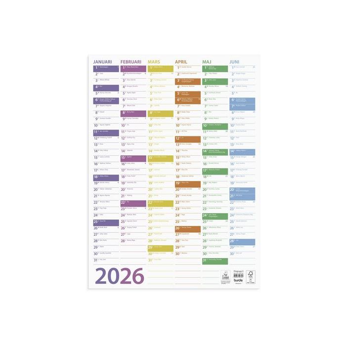 Väggkalender 2026 från Burde. Format: 360x490 mm. Layout: Halvår/sida. Kalendarium: 2026-01-01