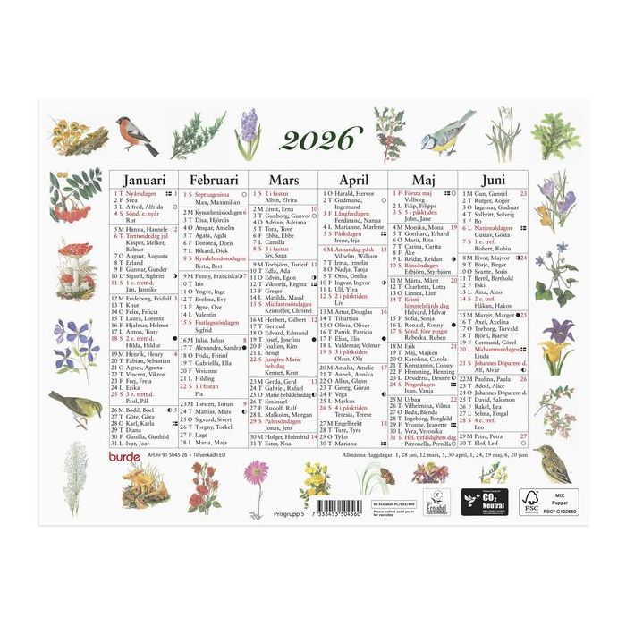 - 2026-12-31. Innehåll: Kyrkliga helgdagar, Flaggdagar, Helgdagar, Månfaser, Namnsdagar. Antal sidor: 2. Miljöinformation: FSC®. Klimatkompenserad. Ecolabel.