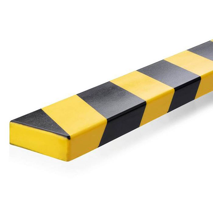 Självhäftande väggskydd med stötdämpande effekt. Svart/gula ränder varnar och uppmärksammar för eventuell risk.